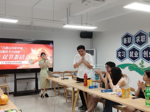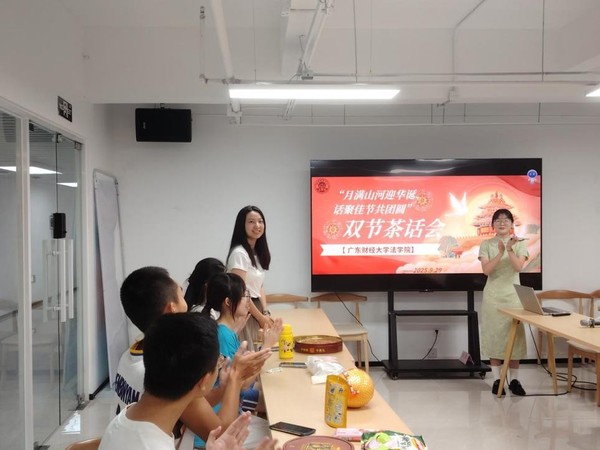 值此金秋佳节、祖国华诞将至之际,为共庆双节盛景、深化师生情谊,2025年9月29日晚上,广东财经大学法学院于广州校区揽月楼304会议室举办“月满山河迎华诞,话聚佳节共团圆”双节茶话会活动。法学院研究生辅导员周星帆老师、本科生辅导员吕锐老师以及研究生、本科生代表齐聚一堂,欢庆中秋佳节,此次活动由法研会文体部陶凯丽同学主持。