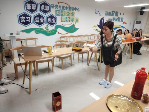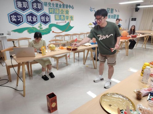 随后,“数字炸弹+猜灯谜”“中秋欢唱”“中秋投壶”等活动环节依次开展,现场气氛热闹,欢声笑语不断。“数字炸弹+猜灯谜”环节,数字猜测的紧张感与灯谜挑战的欢乐相交织,诗词与灯谜相交融,彰显浓郁传统文化气息;“中秋欢唱”环节,同学们纷纷献唱,抒情或欢快的旋律回荡室内,掌声与欢笑声此起彼伏,为双节增添青春色彩;“中秋投壶”环节更是将氛围推向高潮,同学们手持箭矢专注投壶,投出的期待与投中的欢呼,让古老民俗游戏焕新活力,大家也在游戏中,感受着中秋传统习俗的独特魅力。活动中,月饼、水果及各色零食让现场更显团圆温馨,师生在轻松愉悦中交流互动。