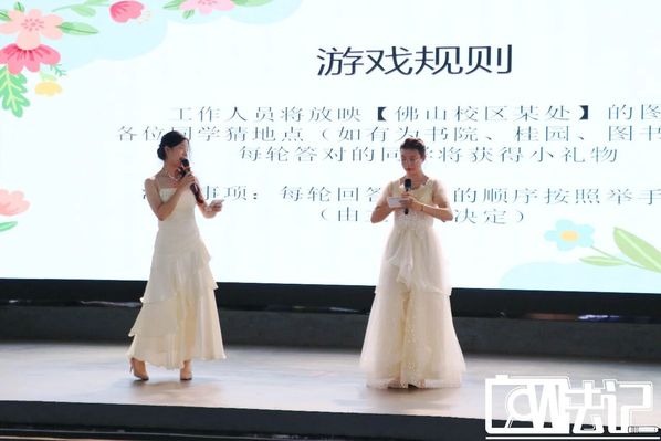 欣赏完舞蹈节目,进入中场游戏环节——“猜猜我在哪里”,大屏播放佛山校区的校园风景照片,观众需要在限定时间内举手,并回答出图片中地址的名称。