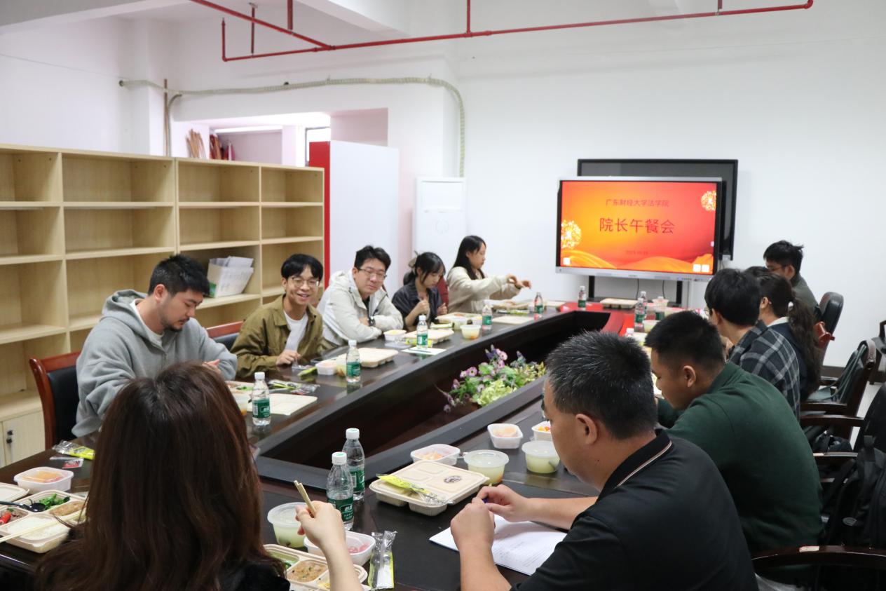 为深化师生沟通渠道,加强与学生的交流联系,2025年10月23日中午,法学院于广州校区立德楼七楼第二会议室开展师生座谈“院长午餐会”。法学院院长赵景琛教授、副院长刘薇教授、副院长邹郁卓副教授,研究生辅导员刘高强老师、研究生学科秘书老师何伟俊及各班研究生代表10余人参加活动。午餐会由刘薇主持。