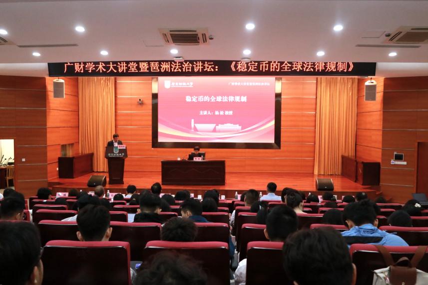 2025年10月26日上午,由广东财经大学法学院、广东财经大学科研部、广东财经大学法治与经济发展研究所联合主办的“广财学术大讲堂 琶洲法治讲坛——稳定币的全球法律规制”主题讲座于广州校区勤学楼408举行。本次讲座由沈阳师范大学校长、中国法学会国际经济法学研究会副会长、银行法学研究会副会长杨松教授主讲,广东财经大学校长于海峰致欢迎词,副校长鲁晓明主持。科研部部长王方方、法学院党委书记陈静、院长赵景琛、副院长刘薇以及法学院师生代表两百多人参加了讲座。