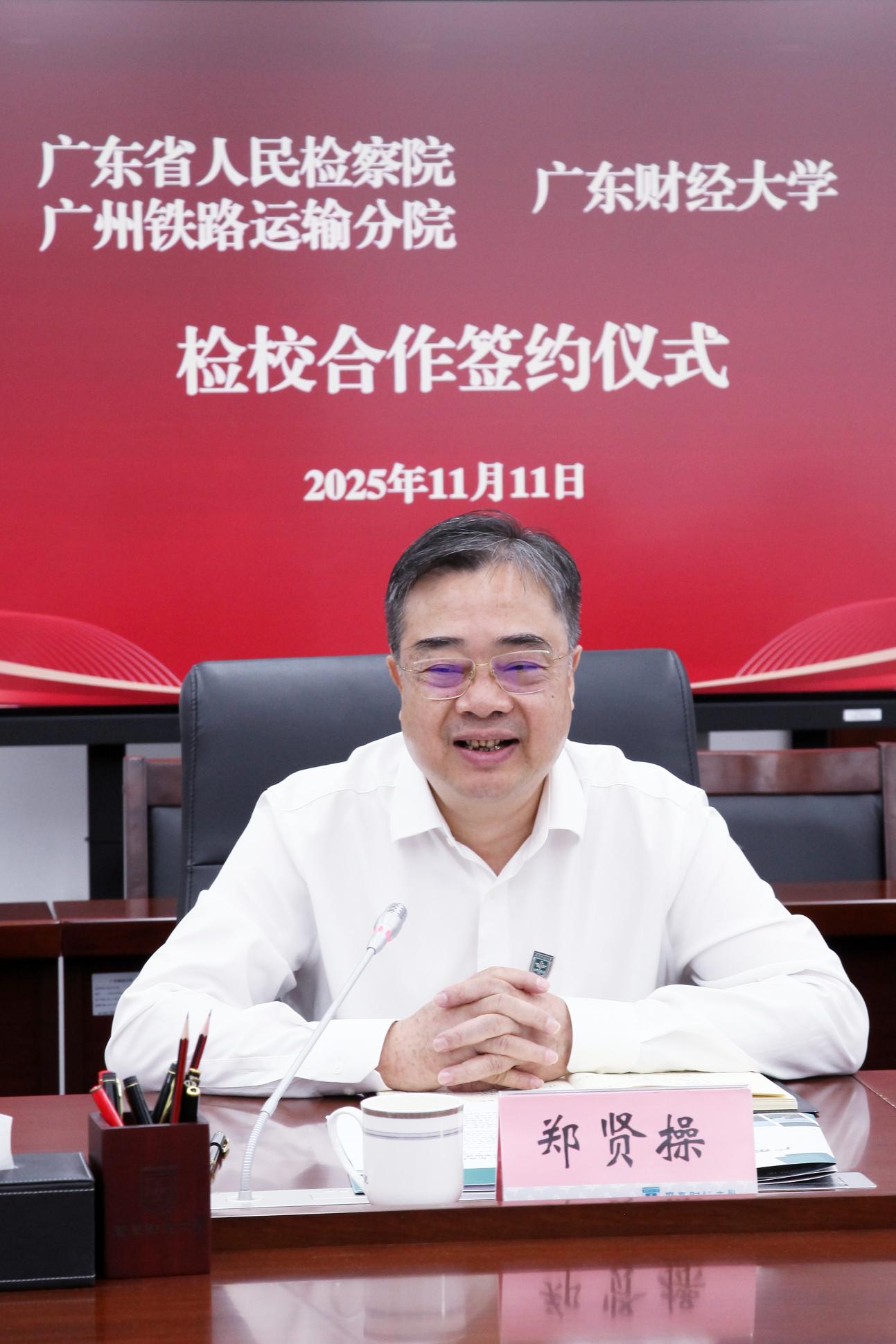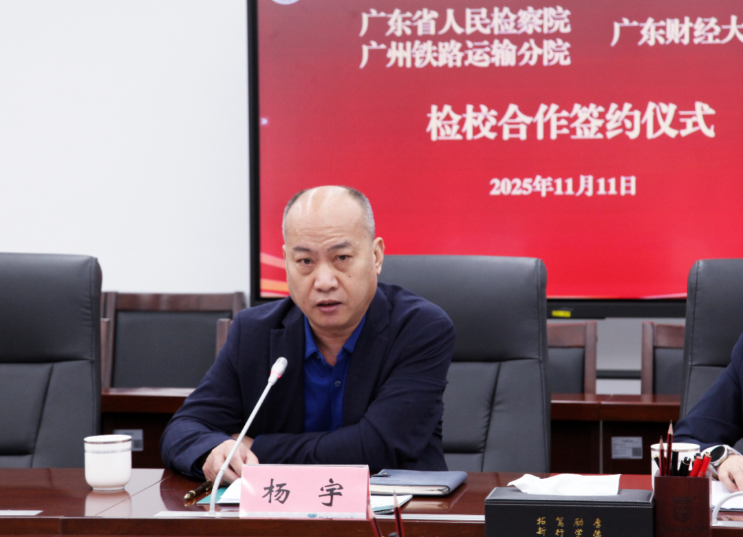 2025年11月11日上午,我校与广东省人民检察院广州铁路运输分院检校合作签约仪式在广州校区同德楼第一会议室举行。校党委书记郑贤操,省人民检察院广州铁路运输分院党组书记、检察长杨宇出席仪式并致辞,副校长鲁晓明主持仪式。