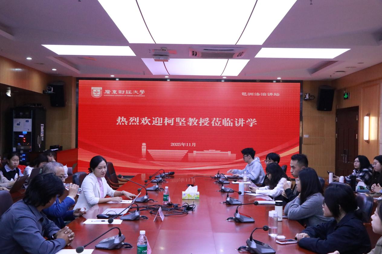 2025年11月26日上午,由广东财经大学法学院、广东财经大学法治与经济发展研究所、广东财经大学法律与社会治理研究院联合主办的“生态环境法典编纂背景下我国环境法学的自主知识创新”主题讲座在广州校区立德楼731法学院第一会议室举行。本次讲座由武汉大学法学院教授、中国法学会环境资源法学研究会副会长柯坚主讲,广东财经大学法学院李丹副教授主持,李伊凡老师以及八十余名研究生同学参加。