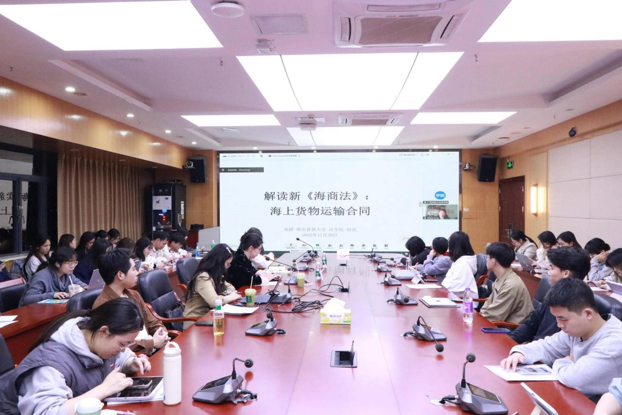 2025年11月28日晚,由广东财经大学法学院、广东财经大学法治与经济发展研究所、广东财经大学法律与社会治理研究院联合主办的“‘学术研习坊’第八十六期:解读新《海商法》——海上货物运输合同”主题讲座在广州校区立德楼法学院第一会议室举行。本次讲座由英国南安普敦大学法学院副教授、博士生导师、英国南安普敦大学法学院民商法研究中心主任赵亮主讲,广东财经大学法学院副院长邹郁卓副教授主持。法学院柯静嘉副教授及九十余名研究生同学参加讲座。