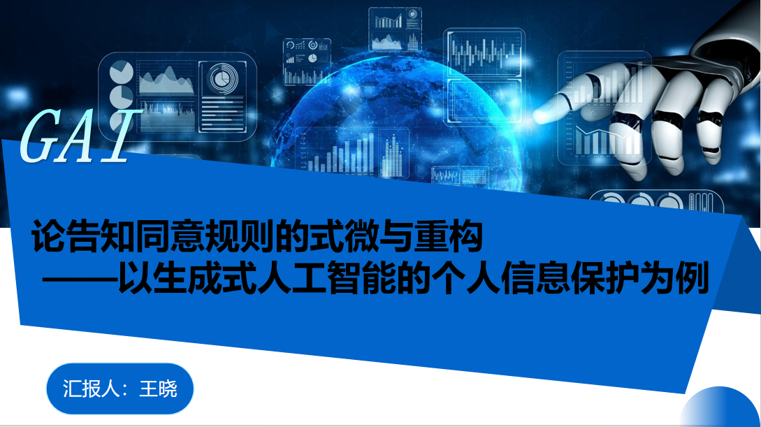 西北政法大学王晓同学以《论告知同意规则的式微与重构——以生成式人工智能的个人信息保护为例》为题作报告。她分享了传统告知同意规则在收集、处理个人信息环节面临的问题,并提出构建分级、动态的新型个人信息同意规则的解决路径。叶一舟在肯定其问题意识的同时,也提醒其需警惕“算法黑箱”概念的滥用,并强调应回归法学基本原理,深化对“同意”免责内涵的理解。