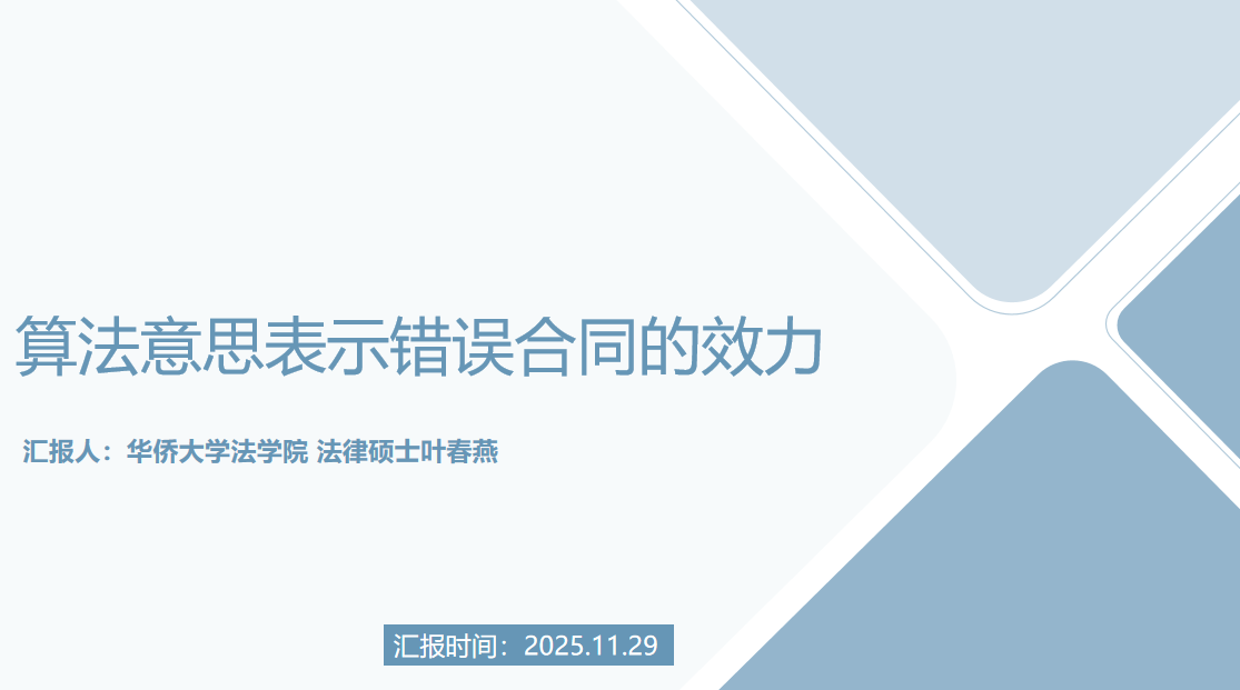 华侨大学叶春燕同学以《算法意思表示错误合同的效力》作主题报告,她辨析了自动化与自主化算法在意思表示归属、错误认定及合同效力上的差异,明确其错误与风险的不同归责原则。王海洋充分肯定其比较法视野与文献功底,同时指出需进一步聚焦主题、优化论文结构、凝练关键词表述,并加强中外制度比较的深度与代表性。