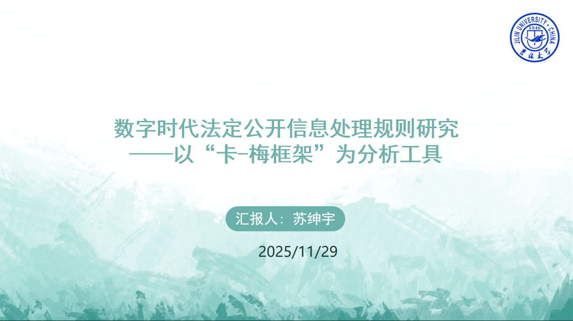 吉林大学苏绅宇同学作《数字时代法定公开信息处理规则研究——以“卡-梅框架”为分析工具》的主题发言,聚焦个人信息保护法相关条款冲突问题,提出强化责任规则、弱化财产规则,并通过保障删除权等方式平衡信息流通与权益保护。谢宇肯定选题创新性、前沿性与理论实践价值,文章逻辑清晰、论证结合案例、引证规范,但指出应加强宪法中公民基本权利论证,增强权利救济部分论述。