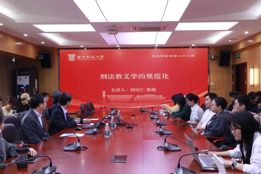 2025年12月19日上午,由广东财经大学法学院、广东财经大学企业合规研究院联合主办的“‘学术研习坊第八十八期’——刑法教义学的规范化”主题讲座于广州校区立德楼731法学院第一会议室举行。本次讲座由中国社会科学院大学法学院刑法教研室主任、博士生导师何庆仁教授主讲,广东财经大学发展规划处处长谢雄伟教授主持。法学院蔡孟兼副教授及八十余名研究生同学参加。