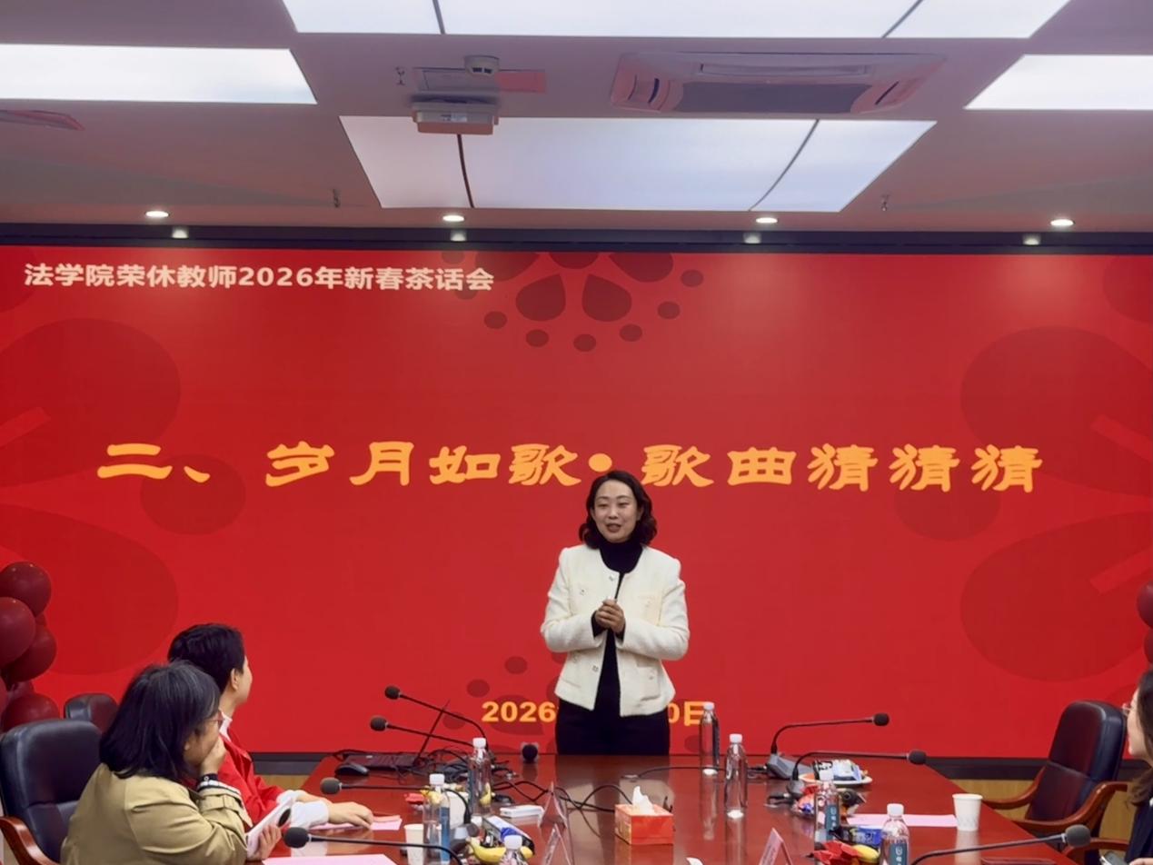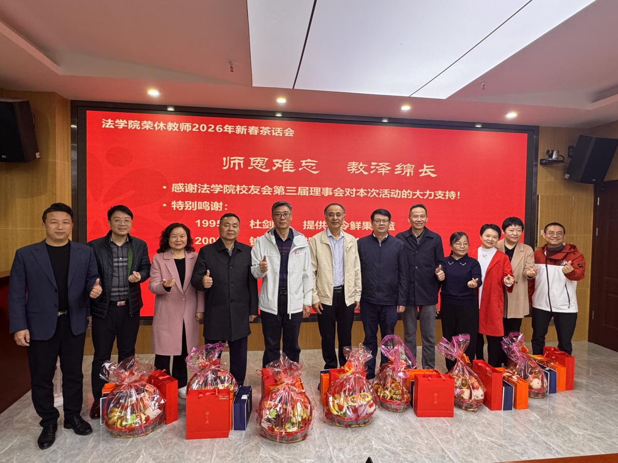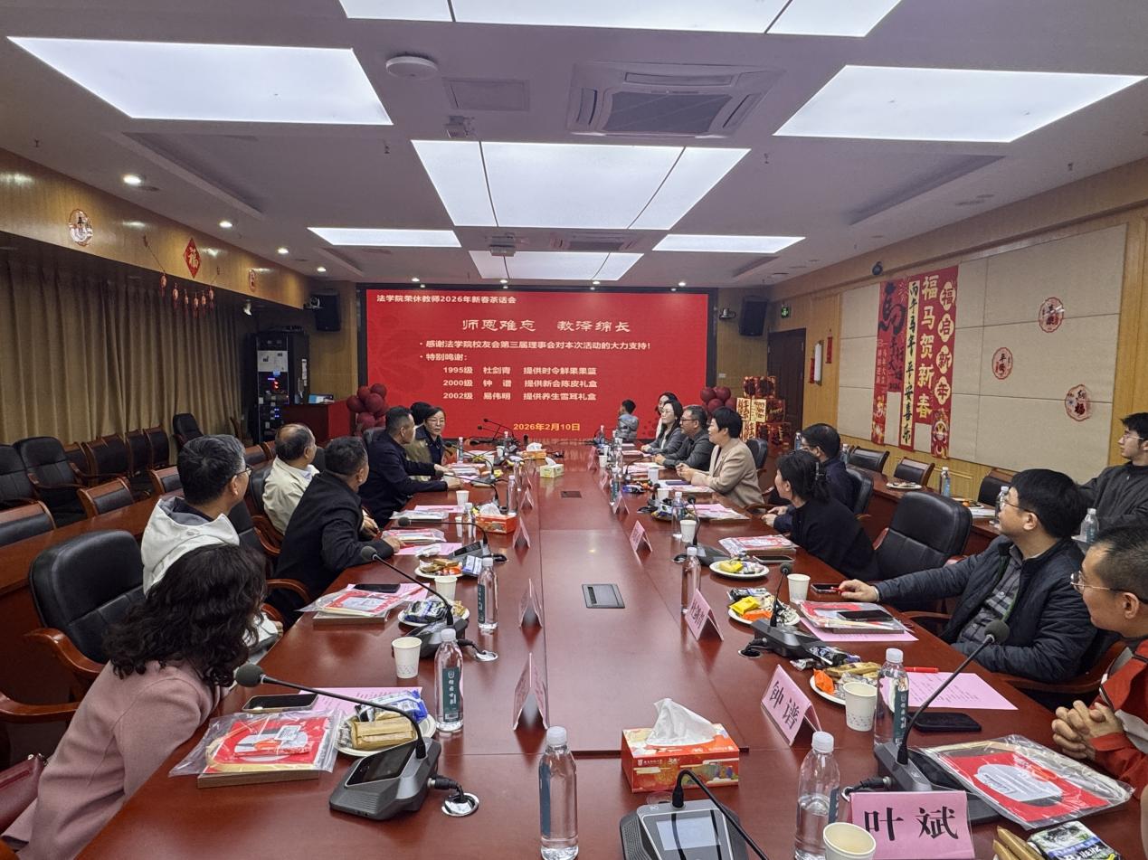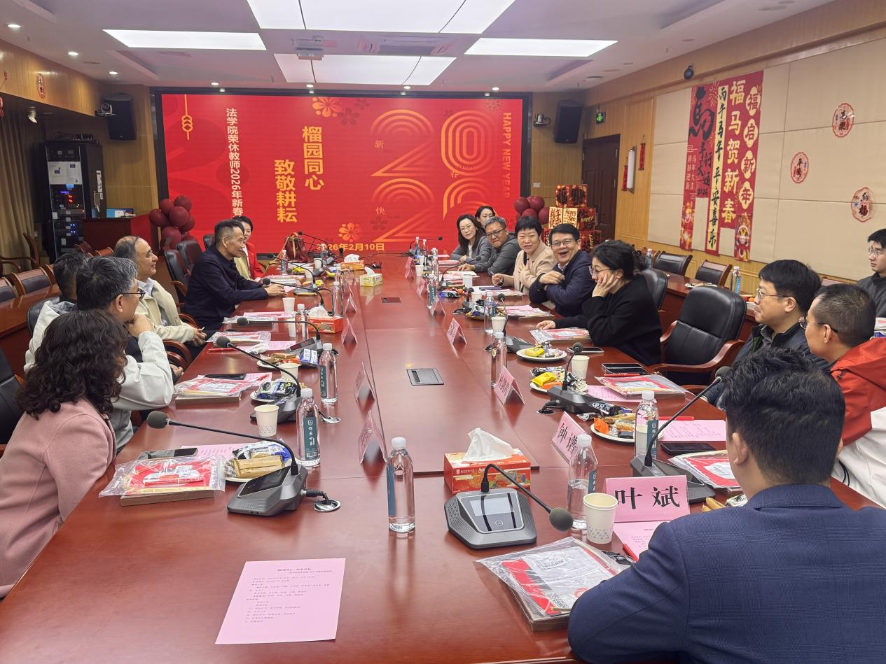 2026年2月10日,“榴园同心 致敬耕耘”法学院荣休教师2026年新春茶话会在立德楼法学院第一会议室举行。副校长鲁晓明,荣休教师王学沛、邓鹤、于志宏、彭真军、梁桂青、徐静莉、金美兰,法学院党委书记陈静、党委副书记罗伟,副院长刘薇、邹郁卓,法学院校友会理事会执行会长钟谱、常务副会长杜剑青、副会长叶斌,以及在校生代表齐聚一堂,畅叙情谊,共迎新春,展望未来。活动由罗伟主持。