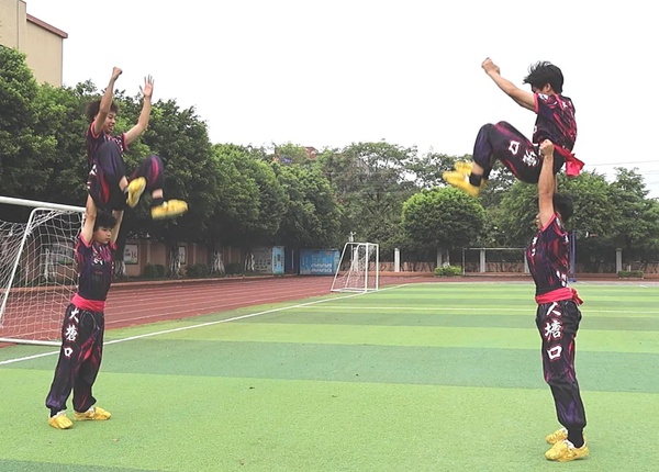 在新雅街道团结村和红棉小学,大塘口醒狮队平均年龄16岁的年轻队员向我们展示了“腾跃”、“金鸡独立”等高难度醒狮技艺。