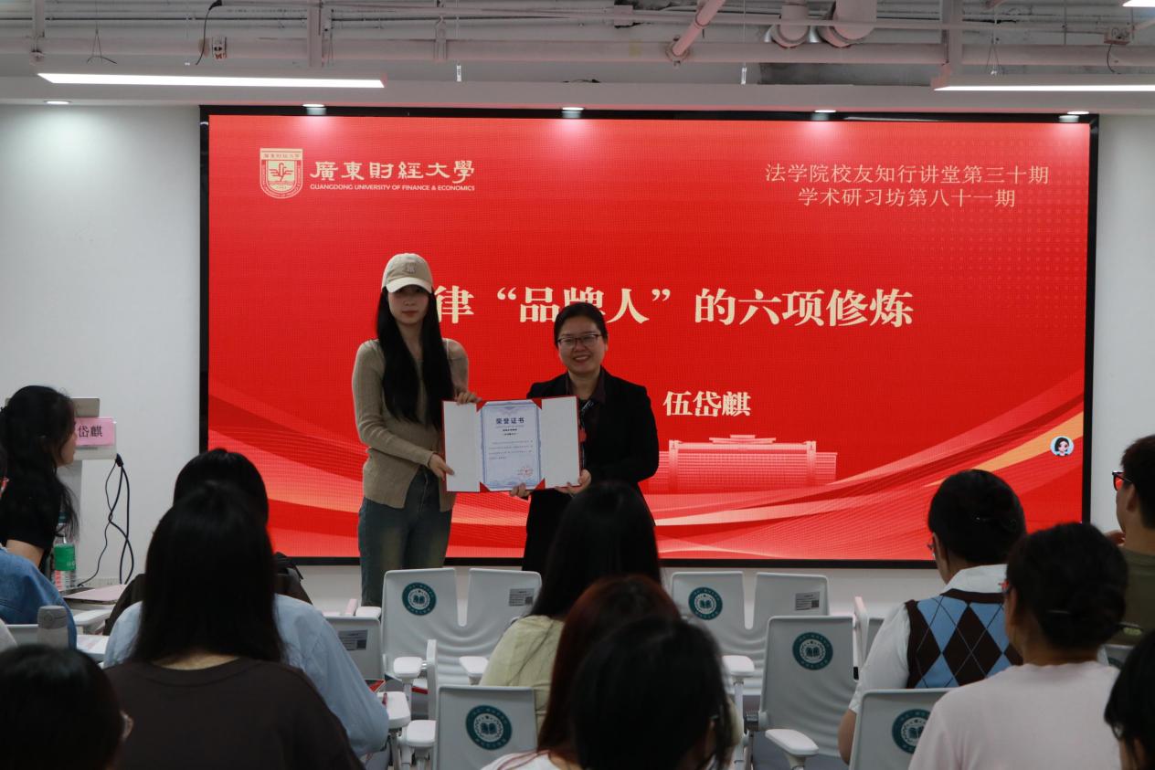 2025年12月12日晚,由广东财经大学法学院、法学院校友理事会联合主办的法学院校友知行讲堂第三十期、学术研习坊第八十一期“法律品牌人的六项修养”讲座在广州校区凌云楼337学术报告厅顺利举行。本次讲座由上海财经大学MBA,广东财经大学校友总会理事、品牌管理专家,“品牌六维魔方”理论体系创立者、广东省企业品牌建设促进会副会长伍岱麒主讲,法学院夏源泽同学主持,五十余名本科及研究生同学参加。
