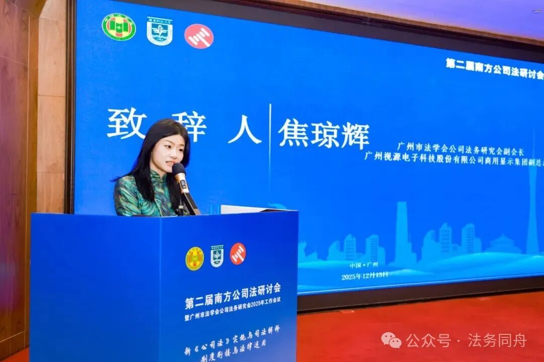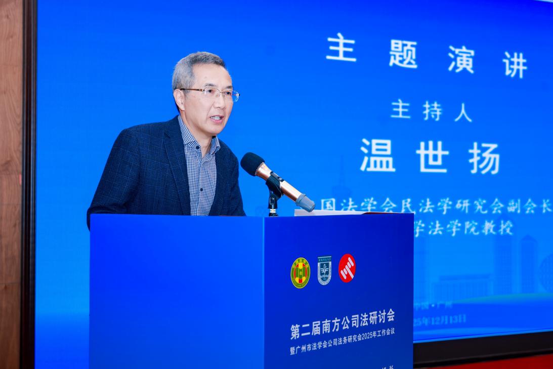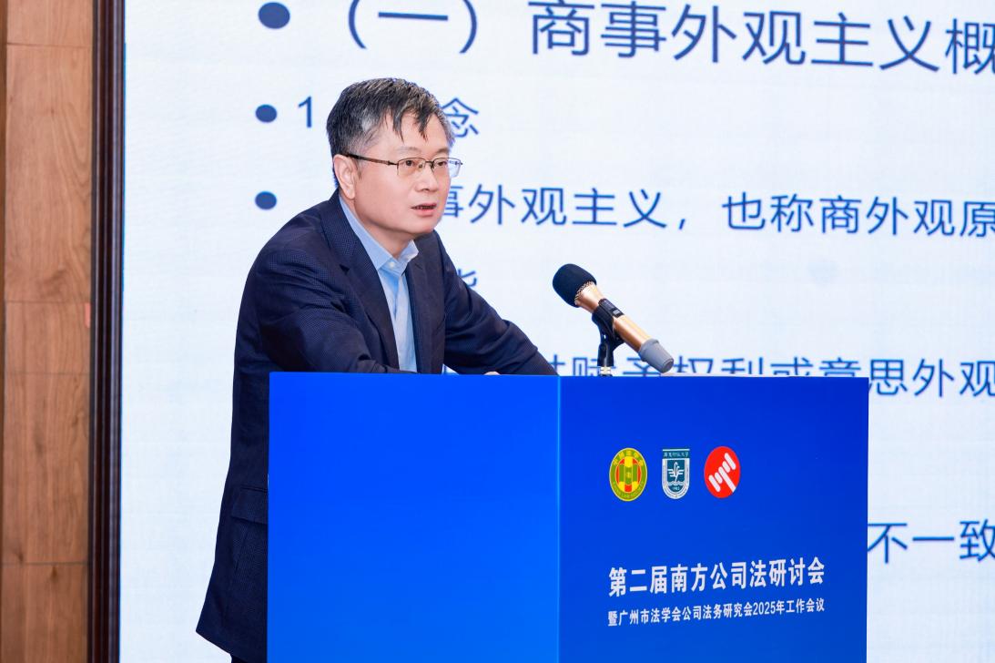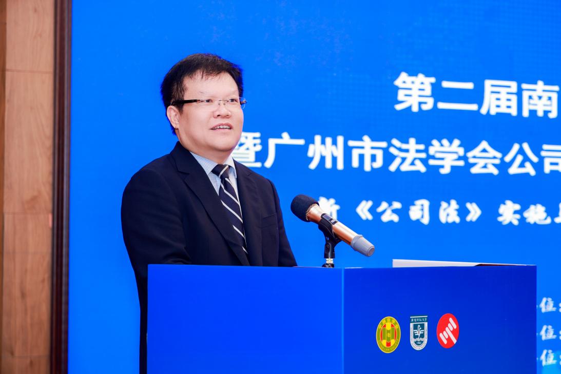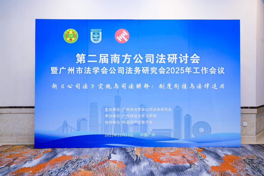 2025年12月13日,由广州市法学会公司法务研究会主办,广东财经大学法学院承办、阿里资产交易平台协办的“第二届南方公司法研讨会暨广州市法学会公司法务研究会2025年工作会议”在广州成功召开,主题为“新《公司法》实施与司法解释:制度衔接与法律适用”。来自法学界、法律实务界、企业界、相关社会组织及研究会的权威专家与各界代表200余人齐聚一堂,围绕新公司法相关重大理论与实践问题展开深入交流研讨。本次研讨会特别开设了线上直播通道,超500名同仁在线同步观看,实现了学术资源的高效共享与传播。广东财经大学副校长鲁晓明教授、广东财经大学法学院院长赵景琛教授、教师曾祥生教授、李震东副教授、龚柳青讲师、黎业明讲师、李忠鲜讲师及40余位研究生到场参加。