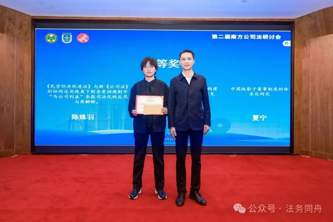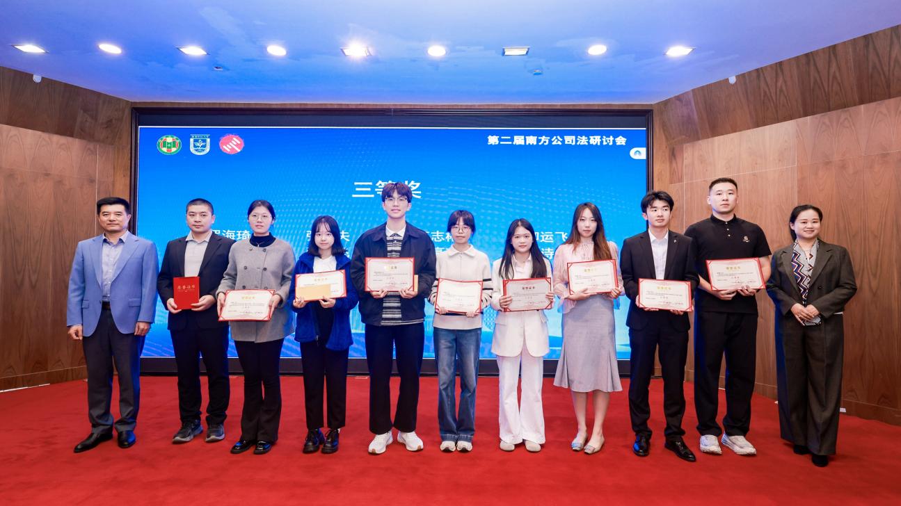 优秀论文颁奖仪式同步举行,对本次研讨会征集的优质学术成果予以表彰,激励学界持续关注新公司法研究与法治实践创新。其中,我院2024级民商法学硕士研究生薛涛撰写的论文获得二等奖;2024级法律硕士(非法学)研究生魏宽、2024级民商法学硕士研究生罗海琦、2025级法律硕士研究生梁诗敏撰写的论文获得三等奖;2023级法律硕士研究生陈泽深、2024级民商法学硕士研究生孙宇轩、2024级法律硕士(非法学)研究生李芷涵、2024级法律硕士(非法学)研究生钟睿瑶、2025级民商法学硕士研究生吴秋怡撰写的论文获得优秀奖。