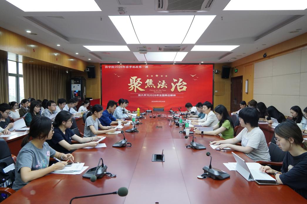 2026年3月24日下午,法学院党委书记陈静在立德楼法学院第一会议室为法学院学生党员、党员发展对象、入党积极分子代表七十余人讲授2026年春季学期“思政第一课”。